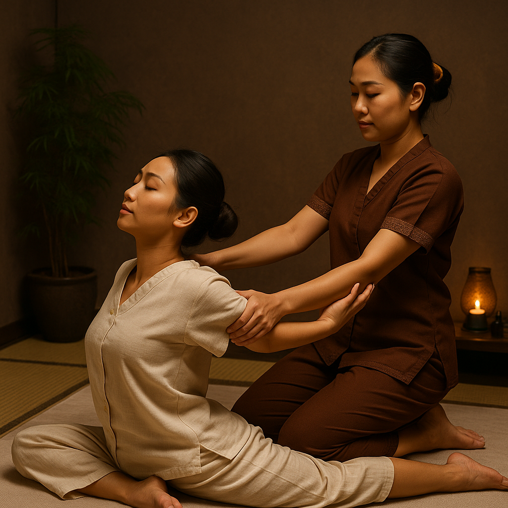 Ancient Thai healing art of deep tissue stretching to relieve muscle tension throughout the body to encourage good circulation for natural balance and positive energy.